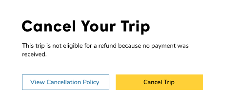 Clicking the link, the user lands on the /Cancel page. Here, the user sees their Trip’s eligibility for cancellation.